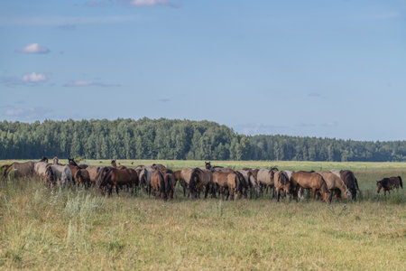 A herd of thoroughbred horses grazes on a beautiful green summer field.