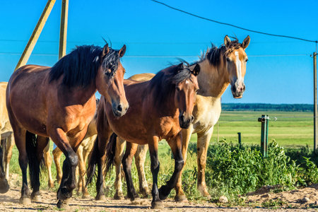Beautiful horses in a herd on a sunny day in the countryside