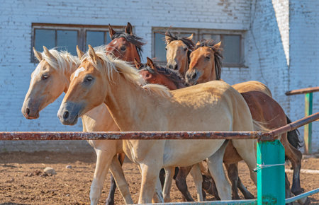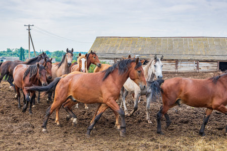 A herd of horses gallops around the horse yard against the background of the old stable, summer day.