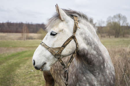 White beautiful horse grazes in the field. White horse on green grass in a beautiful place. Pet mount. High quality photo