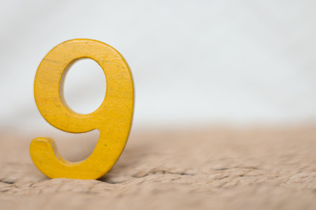 Close-up wooden yellow figure number nine on a white blurred background, holiday date, anniversary, jubilee greeting card with copy space for text