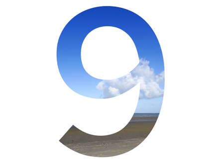 number 9 of the alphabet made with beach, sea and blue sky, north sea, Netherlands, isolated on white background