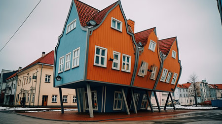 Köln or Cologne / Germany - New Year 2018: A row of colorful gingerbread houses in central European city Cologne. Cold forecast weather, gray moody feeling, winter anxiety. Promenade near river Rhine.