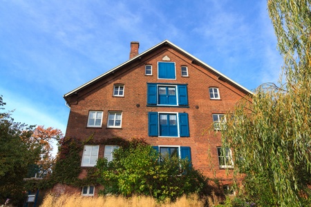 Former warehouse building in the autumn sun, now used as a residence