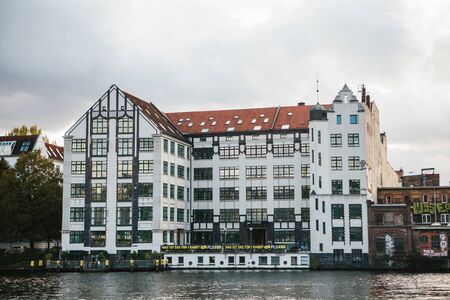 Berlin, October 1, 2017: View of the street and the traditional apartment building next to the river in Berlin.