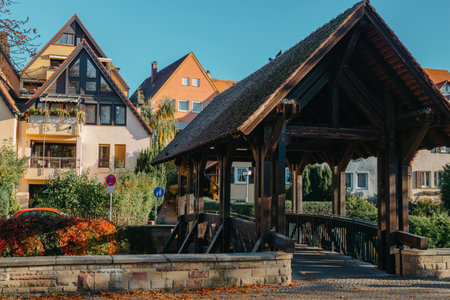 Bad Windsheim, Germany - 16 October 2019: View from a half timbered house in a german village. A village street in the foreground
