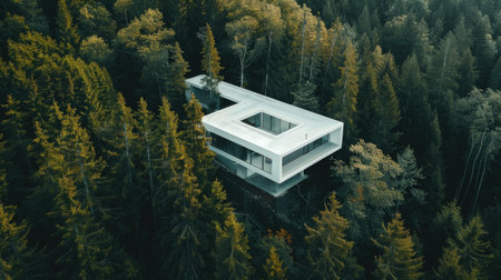 a modern white building nestled amidst a serene coniferous forest