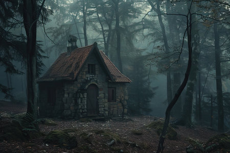 An eerie stone cabin in a dark, misty forest, surrounded by towering trees.