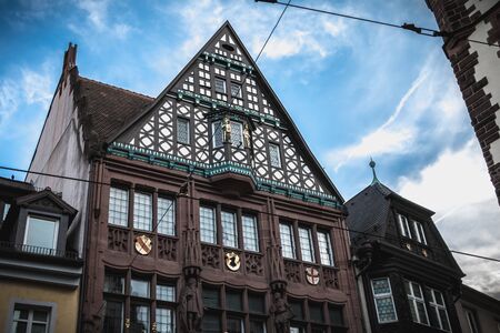 Freiburg im Breisgau, Germany - December 31, 2017: Architectural detail of a typical historic downtown town house on a winter day