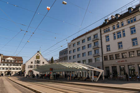 Saint Gallen, Switzerland March 9, 2022 People are waiting for the bus at the popular market place station in the city center