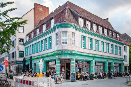 BIELEFELD, GERMANY. JUNE 12, 2021. Historical cafe Kachelhaus with people enjoying the sun. Beautiful view of small german town with typical architecture. Restaurants on the street.