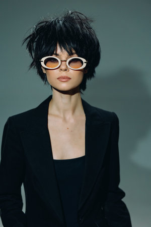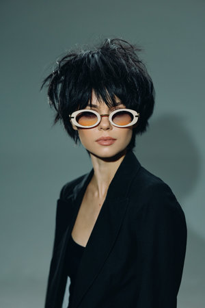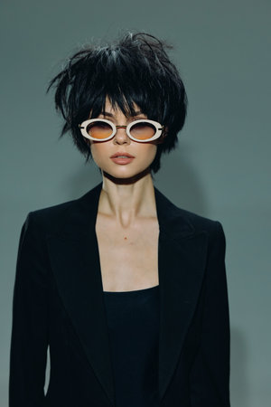 Stylish woman with short black hair wearing white sunglasses and black blazer against gray background