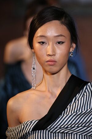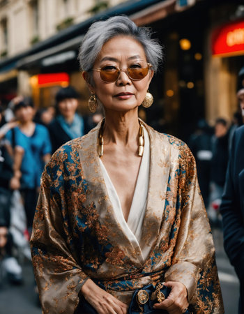 60 year old Asian female model in Paris Fashion Week. ai generative.