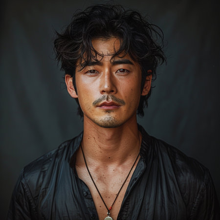 Portrait of young Asian man with dark long hair in traditional clothes looking at camera