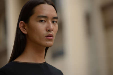 Face of young Asian man with long hair in the city