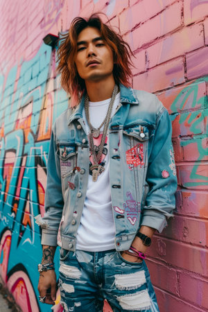 Fashionable young man with denim jacket posing against vibrant graffiti wall background AI Generative