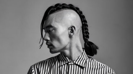 A man with a shaved head and pony tail wearing striped shirt, AI