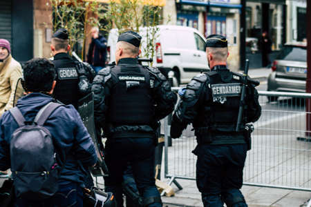 Rear view of police officer wearing helmet and shield securing the zone in frong of the Yellow vests movement gilets jaunes protesters on Quai des Bateliers street .