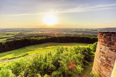 Sunset at Giechburg Castle Ruin in Franconia, Germany. Lovely Summer sunset in the rural countryside of Bavaria on a warm june day. Medieval Architecture and blue sky