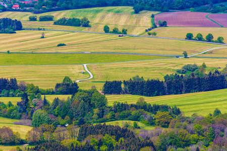 View to hills and fields of Rheinland-Pfalz state with village from tourist route on Hessen state