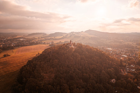 Aerial view of castle ruins Tolstejn with beautiful view to Luzicke hory. Czech republic,