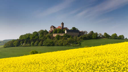 Medieval Castle Ronneburg with canola fields in spring, Wetterau, Hessen, Germany
