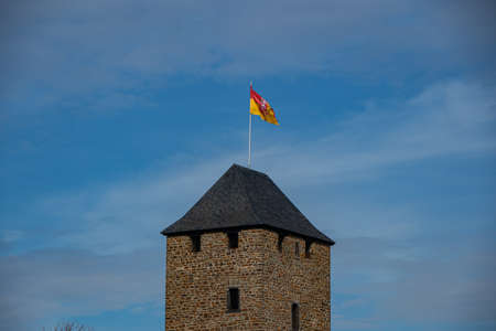 The flag of Germany on the tower of a medieval fortress against the blue sky