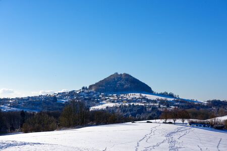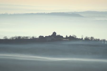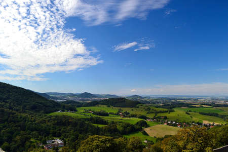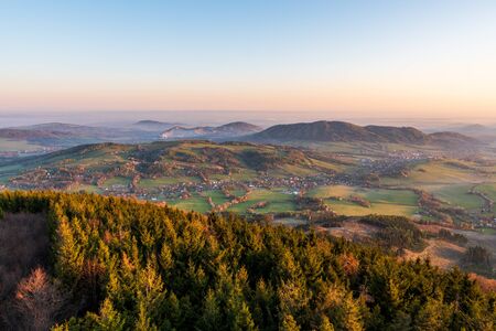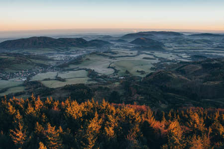 Hilly landscape on sunny and foggy day. Weather inversion. Central Bohemian Highlands, Czech: Ceske stredohori, Czech Republic.