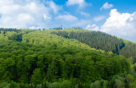 Landscape with lots of clouds in the mountainous area of the Beskydy Mountains during a sunny afternoon.