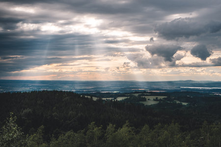Rays of light shining through dark clouds dramatic sky with cloud, Sky background on sunrise nature composition The beam of light through the dark clouds on the mountains, Czech republic, Orlicke hory