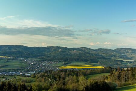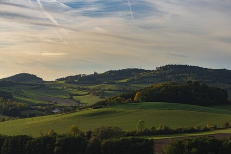 Fields pasture land and meadows in sunset evening near Besiny village in Sumava national park