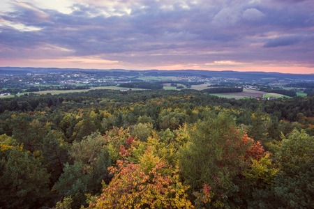 Warm orange and pink colors of sunset air over town in countryside, viewed from the hill over woodland in autumn fall
