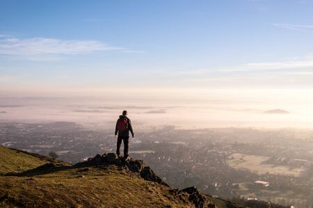 A lone hiker standing on top of a rock looking out across a misty winters sunrise, Worcestershire Beacon, Malvern Hills, UK.