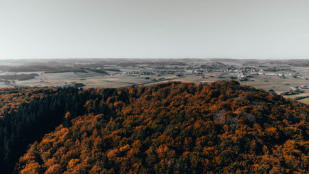 A beautiful view of dense autumn forest with colorful trees on the hill with small houses background