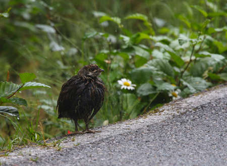 A Spruce Grouse chick (Canachites canadensis) standing at the side of the road. Shot in Jasper National Park, Alberta, Canada.