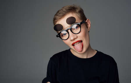 Woman with short hair and dark glasses makeup red lips glamor close-up