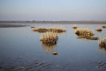 pieces of grass in the water or the marsh along the western scheldt in holland in winter