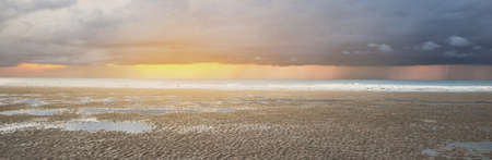 Panoramic view over the tidal flats along the shore of the netherlands with Wadden sea in distance and sky with rain clouds