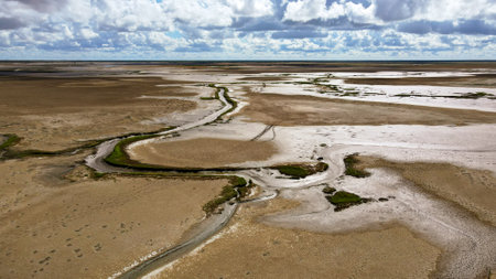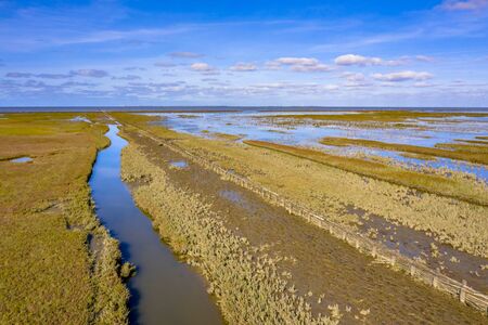 Aerial view of land reclamation Tidal Marshland national park and area Waddensea in Province of Groningen. Netherlands