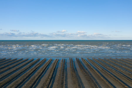 Long rows of oyster racks stretch across wet sand at low tide on Utah Beach, facing gentle waves and a bright blue sky. The scene is open and minimal, with rhythmic patterns and a sense of calm along the Normandy coast.