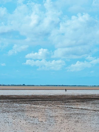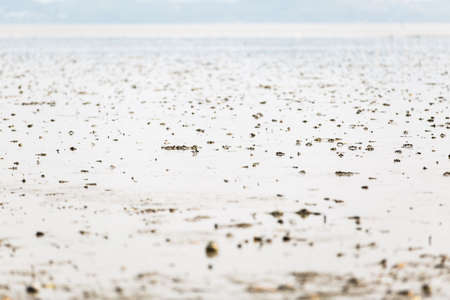 Landscape view of Fisherman looking for shellfish on mud at low tide. Beautiful view of the sea after the water is reduced to rubble and mud. Collecting food by village fisherman in low ocean tide.
