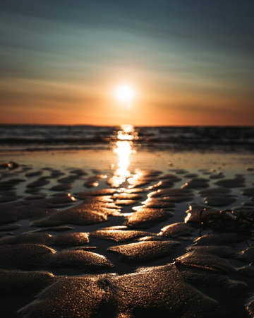 A serene beach scene capturing gentle ripples on wet sand illuminated by the warm glow of a sunset. Ideal for inspiration and relaxation themes.