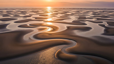 With showing aerial view of a tidal flat at sunset with winding water channels reflecting the golden sun creating a natural pattern and serene landscape.