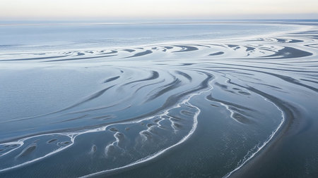 An aerial perspective of a vast tidal landscape revealing intricate patterns of water channels and sandbanks under a soft, muted sky.