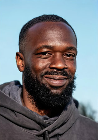 Smiling African American man with a beard, dressed in a casual hoodie, stands outdoors against a clear blue sky, radiating confidence and friendliness, AI generated