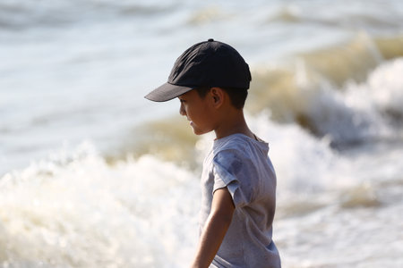 A young boy stands near the shore, enjoying the ocean waves. The scene captures the essence of childhood bliss, joy, and a carefree summer day at the beach.