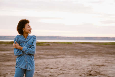 Young black woman wearing denim shirt smiling and looking aside outdoors