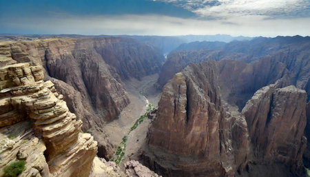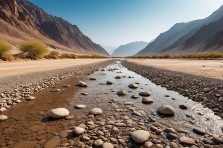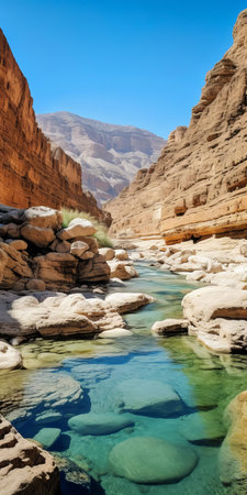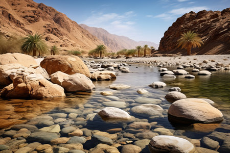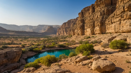 wadi, a serene and majestic natural wonder, winds its way through the arid desert landscape, its rust-hued rock formations and lush green oases a striking contrast, inviting exploration and discovery of the region's unique geological and ecological heritage. ai generated