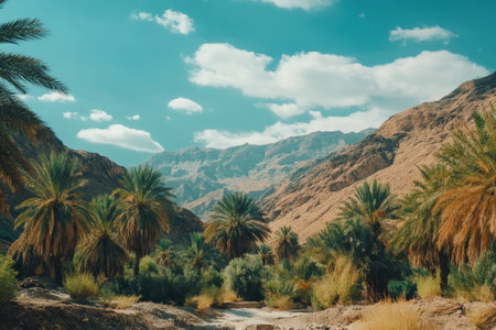 Stunning desert oasis surrounded by majestic palm trees and breathtaking mountains