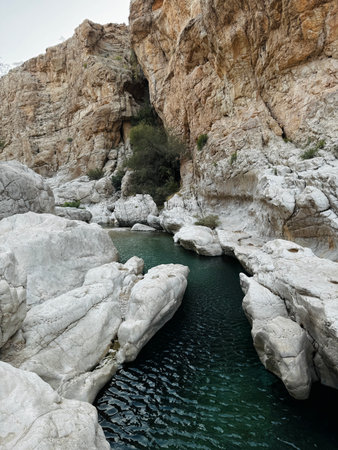 Landscape of Oman. Lagoon in the middle of Wadi Tiwi in idyllic day.